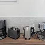 Willa ma pełnowymiarową kuchnię z kuchenką mikrofalową, lodówką i przyborami kuchennymi.